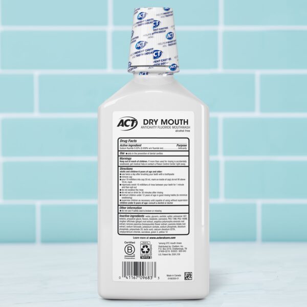 Experience relief from annoying dry-mouth symptoms with ACT Dry Mouth Anticavity Fluoride Mouthwash. This alcohol-free mouthwash is powered by sodium fluoride to provide anticavity protection, strengthen tooth enamel and allow you to swish away particles brushing may miss. Each bottle contains seven moisturizers and xylitol for soothing relief from dry mouth that can be caused by medication or medical conditions. ACT Dry Mouth Mouthwash also soothes the effects of dry mouth with the help of two hydrating polymers that coat oral tissues and lock in moisture. It features a great-tasting soothing mint flavor that freshens breath and helps fight halitosis. As a bonus, this gentle mouthwash is nonirritating, alcohol free and dye free. Rethink your rinse and choose ACT Dry Mouth Mouthwash for relief from dry-mouth symptoms.