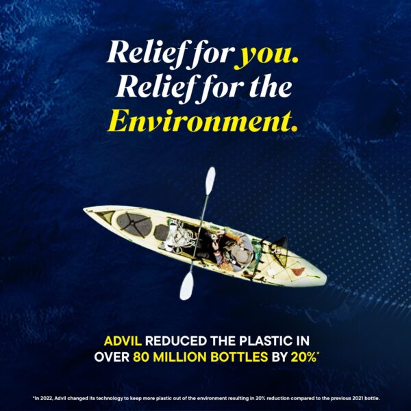 - Advil 200mg ibuprofen pain reliever provides relief with packaging with 20% less plastic by 2022 to keep 500,000 pounds of plastic out of landfills