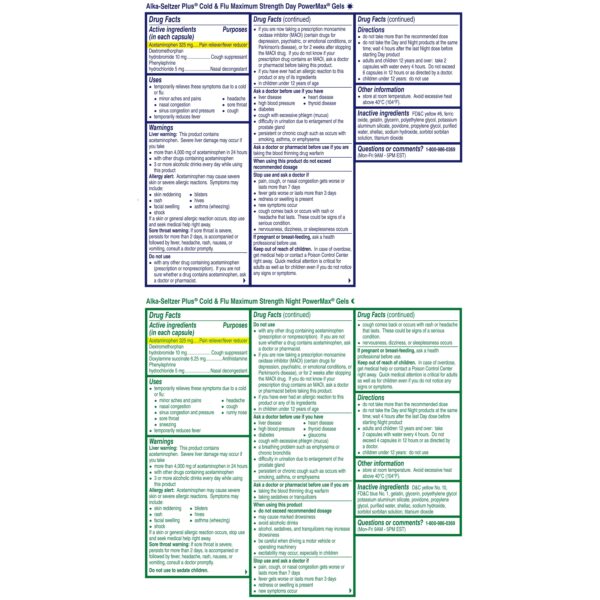 When you need daytime relief from your cold or flu symptoms – and a restful night so you can tackle the next day – turn to Alka-Seltzer Plus Maximum Strength* Day & Night Cold & Flu Liquid Gels for fast, effective relief. In one convenient package you get: Daytime cold and flu symptom relief from: Nasal Congestion, Cough, Headache & Body Ache, Sore Throat, Sinus Pressure & Fever and Nighttime cold and flu medicine for relief from: Runny Nose, Nasal Congestion, Cough, Headache & Body Ache, Sore Throat & Fever. *Based on 4 hour dosing.