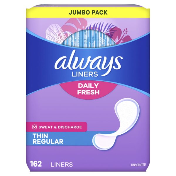 Want to feel fresh all day no matter what you do? Discover Always Thin No Feel Protection Daily Liners Regular for discreet protection against daily discharge and odors. These pantiliners are made to be thin and absorbent for everyday freshness. Plus, Always thin daily liners feature a special Edge-2-Edge adhesive that holds better than traditional adhesives. That means once the liner goes on, you can trust that will stay in place no matter what activities you take part in. Errands, exercise, sports, and other physical activities won’t stand a chance against this superior adhesive option. Always Thin No Feel Protection Daily Liners, Regular, Unscented, 120 CountThere’s no reason to worry about what your day will entail because these panty liners won’t budge. Designed with a breathable layer to help keep you dry. They are individually wrapped for comfortable protection on the go, so you can take them anywhere. The Always Liners Fit sizing chart shows a range of liners for different shapes and needs for you to find your best fit. Get daily protection against discharge and odors that is so discreet you won’t even know it’s there. Thin and discreet, Always No Feel Protection Daily Liners are designed to offer effective, safe, and comfortable protection no matter where your day takes you..