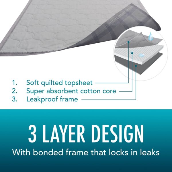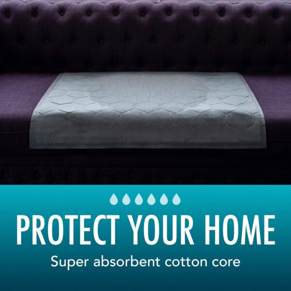 Use Assurance Washable Protective Underpads to protect your furniture and reduce landfill. These reusable multi-purpose pee-proof underpads are suitable for people and pets. Simply lay on a bed, chair, car seat or floor with the quilted side up. They can be reused at least 30 times without deterioration in leakproof performance, and they’re easy to machine wash and tumble dry with your normal laundry. Soft and comfortable, yet strong, they feature a discreet classic print on the reverse layer. Market-leading leakproof and absorbent technology draws urine away from the quilted top layer to the 100% natural core, while the bonded frame locks in leaks.