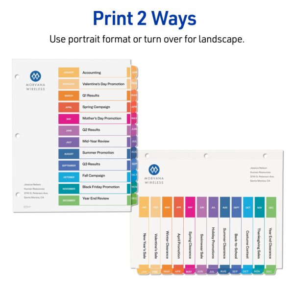 Organize your projects in seconds with Avery Ready Index monthly Binder Dividers. Each tab is uniquely color coded and preprinted to present a professional look. Print customized section titles and images onto the table of contents sheet without worrying about inserts or labels. Whether you’re hosting a meeting or creating binders for classes, these dividers are perfect for getting things sorted. 6 sets of 12 monthly dividers are included with each sheet measuring 8-1/2”x11”. The 3 ring binder holes are reinforced on both sides of the heavyweight sheet to prevent tearing. Each tabbed divider also includes additional reinforcement along the edge of the sheet to distribute stress and resist creasing. The table of contents sheet is also compatible with both laser and inkjet printers. This sheet can be printed in either portrait or landscape so that projects can be organized in any orientation. Just flip the sheet over to view the other layout. Check out the free templates for these dividers and try out the Avery Design & Print software today on the Avery sites