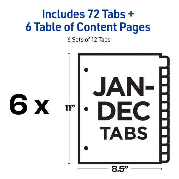 - 6 sets of 12 Jan-Dec dividers are included with sturdy tab and hole reinforcements on both sides