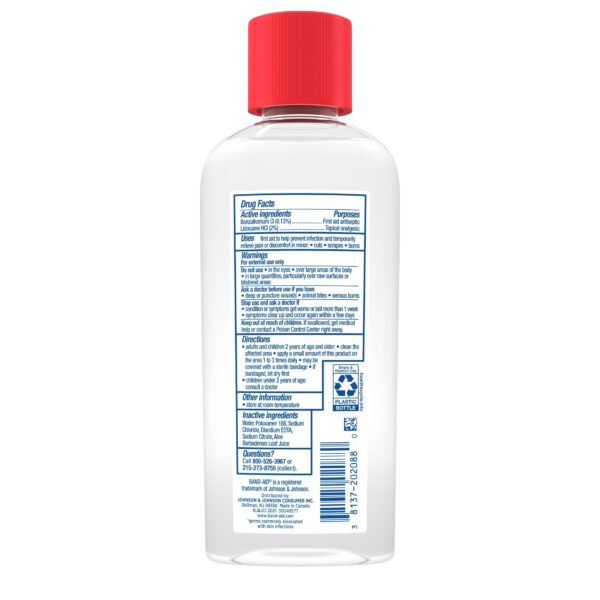 Clean and relieve the pain of minor wounds with Band-Aid Brand Pain Relieving Antiseptic Cleansing Liquid. Formulated with the topical analgesic lidocaine HCl, this antiseptic liquid helps relieve the pain and discomfort of minor cuts, scrapes, and burns. The skin cleaning antimicrobial liquid also contains benzalkonium Cl, a first aid antiseptic, and effectively kills 99.99% of germs* to help prevent infection. The perfect addition to any at-home first aid kit along with other essential wound care supplies, the first aid antiseptic liquid is safe and effective for wound care on kids ages 2 and older. To use, apply a small amount of antiseptic liquid on the affected area one to three times daily and once dry, cover the wound with a sterile bandage. *germs commonly associated with skin infections