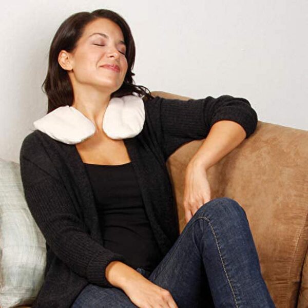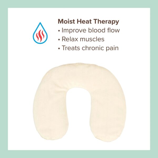 Neck pillow is easily heated in the microwave oven to provide instant relief for aching neck and upper shoulder area. It is compliant to the area and will stay in place. It would also be a good stress reliever for those who tend to “tense” up in the neck area. Gives off a comforting subtle aroma. Very pleasing.