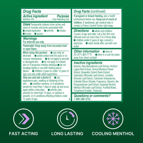 - ARTHRITIS PAIN RELIEF: Fast acting and long lasting, cooling menthol formula delivers penetrating pain relief for sore muscles, backaches, sore joints, bruises, and arthritis.