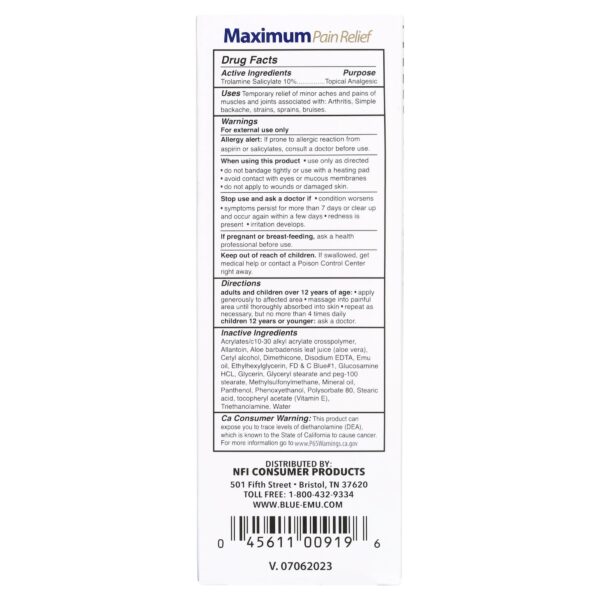 Experience fast and effective relief with Blue-Emu Maximum Pain Relief Cream. Specifically formulated for arthritis, muscle pain, and joint pain, this topical cream contains 10% Trolamine Salicylate, a powerful pain reliever that works like aspirin. The unique blend also includes Emu oil as a carrier for the active ingredient, ensuring deep penetration for targeted relief. Plus, it contains MSM and glucosamine to support your muscles and joints. Apply it on your shoulders, back, hips, knees, or anywhere you experience pain. Say goodbye to discomfort and hello to comfort with Blue-Emu!