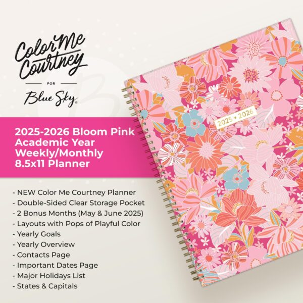 Blue Sky Color Me Courtney 2025-2026 Academic Year Weekly and Monthly Planner Calendar, July 2025 – June 2026, 12-Month, 8.5″ x 11″, Flexible Cover, Wirebound, Storage Pocket, Bloom Pink