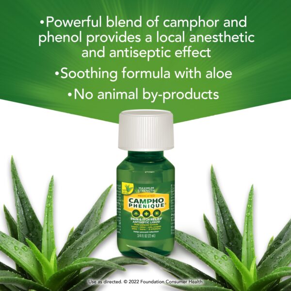 - Campho Phenique Maximum Strength Antiseptic Liquid, Pain Relief and Anti-Itch Treatment, Provides Instant Relief Bug Bites, Minor Cuts and Skin Irritations, 0.75 Oz: