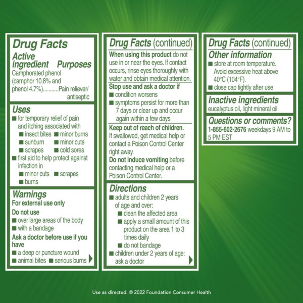 - INSTANT PAIN AND ITCH RELIEF: Formulated with camphor and phenol to temporarily inactivate the pain signals at the nerve endings in the skin the pain signals at the nerve endings in the skin to provide a local anesthetic (numbing effect) that stops pain and itch on contact.