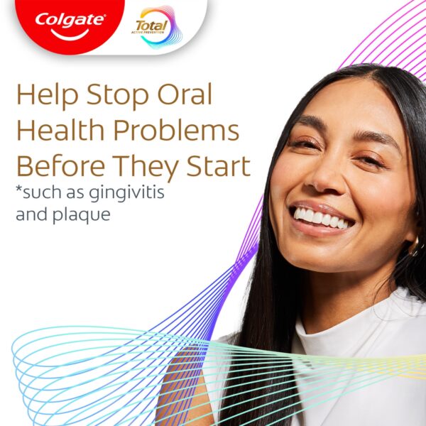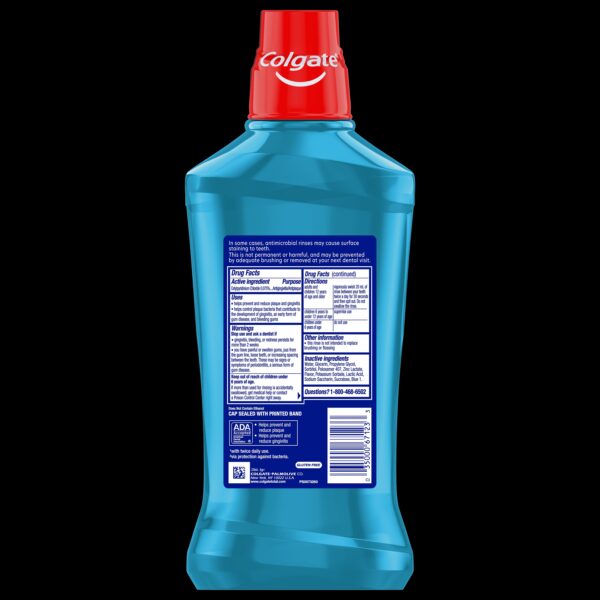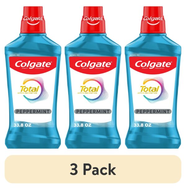 Colgate Total Alcohol Free Mouthwash, Peppermint, 1.0 LExperience a healthy smile and fresh breath with Colgate Total Alcohol Free Peppermint Mouthwash, the only ADA-accepted alcohol-free (1) oral rinse with CPC as an active ingredient for plaque and gingivitis. This no-alcohol mouthwash is designed to deliver 24-hour protection against bacteria. Plus, it’s clinically proven to fight the root cause of plaque, gingivitis, and tartar buildup (2), to help prevent oral health issues (3) before they start.Minty Fresh BreathColgate Total Alcohol Free Mouthwash uses a Zinc formula for freshness and doesn’t burn after use. This alcohol-free Colgate Total mint mouthwash continues to work after you brush, providing ongoing protection from bacteria between brushings.A Complete Approach to Your Oral HealthUse this alcohol-free mouthwash for superior performance (4) and to help prevent many common oral care issues like plaque and gingivitis. For a complete approach to your oral health, use this peppermint mouthwash in combination with the Colgate Total toothpaste and the Colgate Total Active Prevention toothbrush.(1) does not contain ethanol (2) via protection against bacteria (3) such as gingivitis and plaque (4) vs. brushing alone