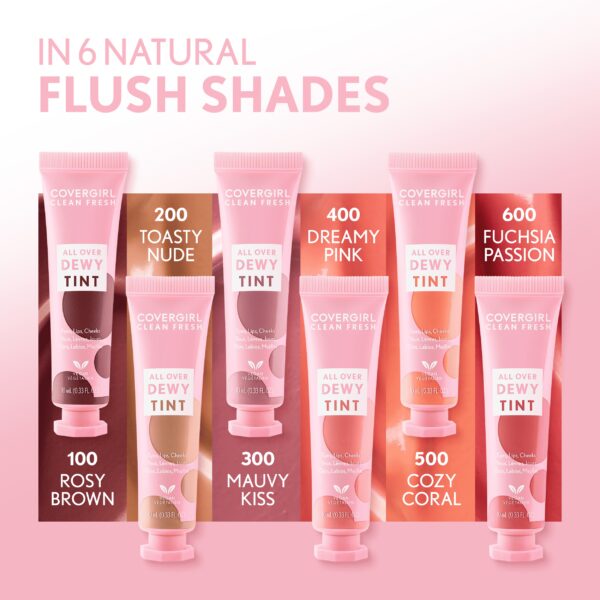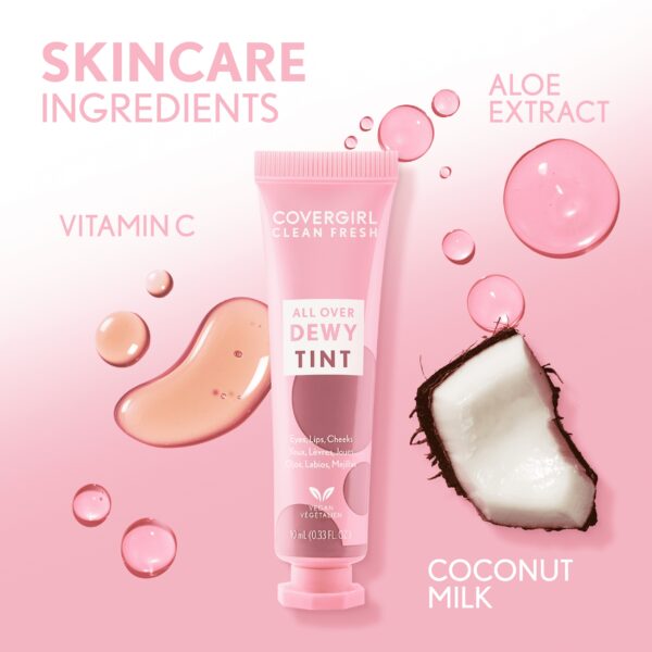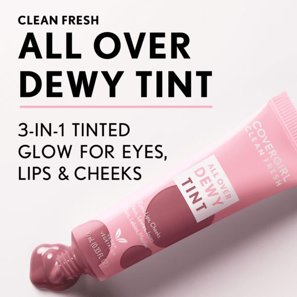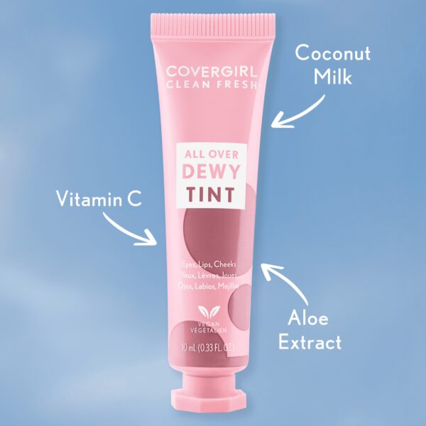COVERGIRL Clean Fresh All Over Dewy Tint. The easiest 3-in-1 tint for eyes, lip and cheek provides a dewy and natural flush from within glow. Clean and Vegan formula, this buildable, gel-cream infused with Vitamin C, Coconut Milk and Aloe Extract blends perfectly and leaves complexion looking recharged, fresh and dewy for the easiest, breeziest no-makeup makeup look. Available in 6 adaptable shades.