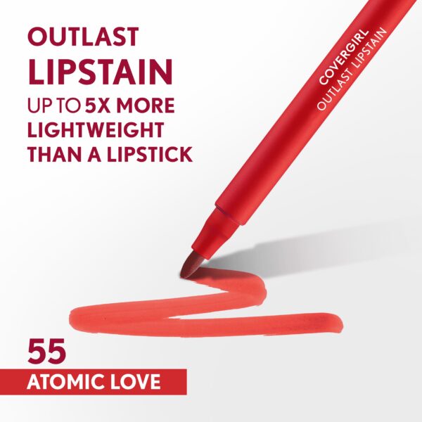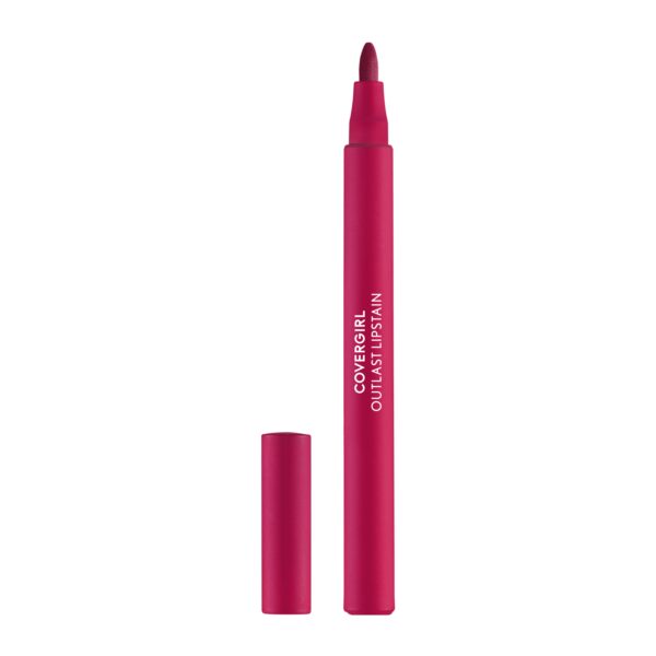 COVERGIRL Outlast Lip Stain. Covergirl’s iconic Outlast Lipstain is back and now vegan! Non-drying, lightweight buildable color that stays put, doesn’t feel tight and feels fresh all day. In just 1 swipe, color glides on smooth and precision pen allows for an effortless application. Transfer-proof formula in 14 gorgeous colors, infused with plant-based Acacia Tree extract, for a Lipstain that won’t kiss off!