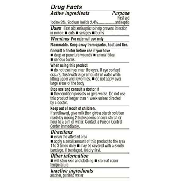 - Iodine 2%, sodium Iodide 2.4%, alcohol, purified water