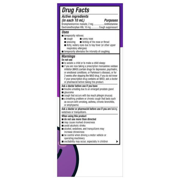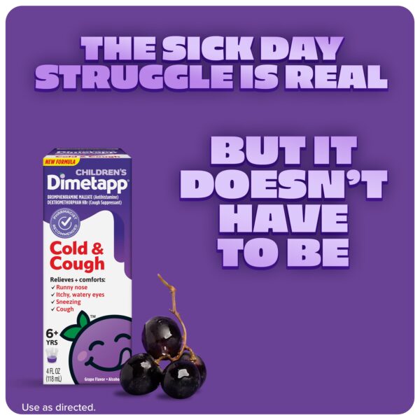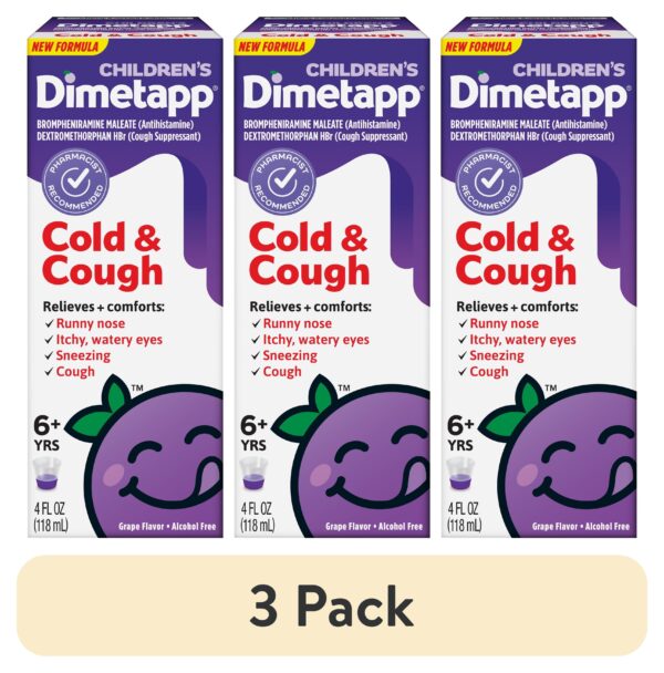 - Children’s Dimetapp Cold & Cough Medicine, Antihistamine/Cough Suppressant, Relieves Cough, Runny Nose, Sneezing, Itchy, Watery Eyes, Grape Flavor, Alcohol & Phenylephrine-Free, 4 fl oz