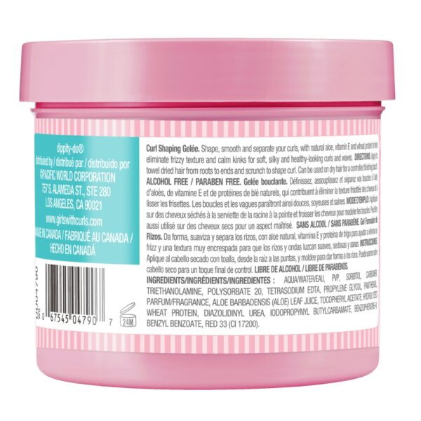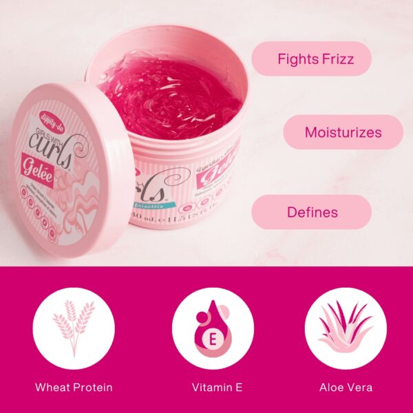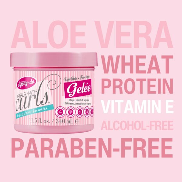 Dippity Do Girls with Curls Anti Frizz Gelee is a moisture rich, frizz fighting styling gel. Curl Shaping Gelée, light hold. The original product that started it all, Dippity-Do Girls with Curls Gelée is the secret weapon every curly haired girl needs. Made to be used by those with curly or coarse hair. Adds intense shine, smoothness, and volume. Leaves your hair easy to style and protects it from environmental damage. Made with aloe vera and wheat proteins. Medium hold formula. Paraben free. Ingredients include Hydrolyzed Wheat Protein and Sorbitol. This is a unisex product.