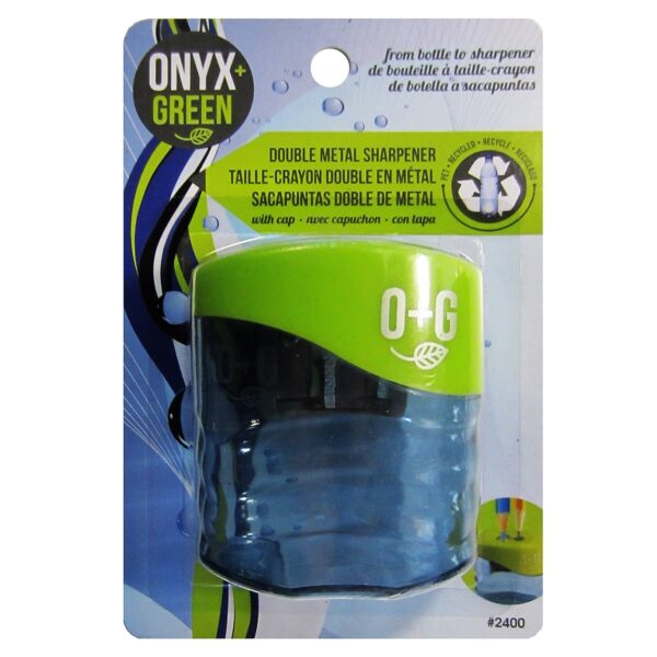 DOUBLE HOLE METAL SHARPENER, WITH RESERVOIR, RECYCLED PET AND RECYCLED PLASTIC, PACKAGED IN RECYCLED CCARTON BLISTER CARD, SOY-BASED INK