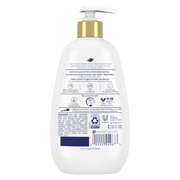 - CARE AS YOU CLEANSE: Dove Prebiotic Boost Hand Wash boosts skin’s moisture and helps restore skin barrier for lasting softness.