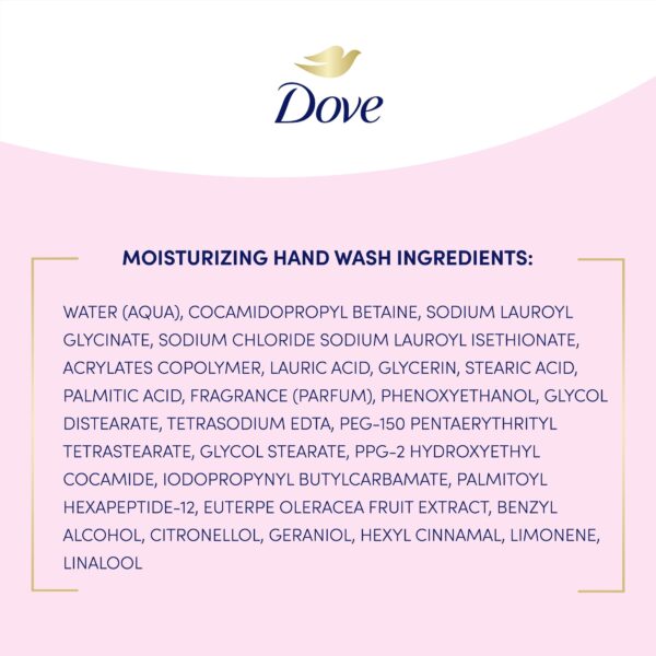 Your hands deserve to be cared for — show them love when you wash using Dove Prebiotic Boost Hand Wash. As we continue to strip our first layer of defense by over sanitizing, the skin loses the ability to protect against invaders to keep itself healthy and moisture to be lost more easily. Dove prebiotic boost hand wash gently cleanses your hands, while adding prebiotic nutrients to replenish skin’s natural moisture barrier for instantly nourished, more resilient skin. Infused with acai and peptides, our dryness remedy formula replenish dry, flaky skin, to give your hands silky feeling after every wash. This moisturizing hand wash is sulfate-free and paraben-free. Dove care goes further than just simple hand cleansing. Cares as you cleanse for lasting softness you can feel.