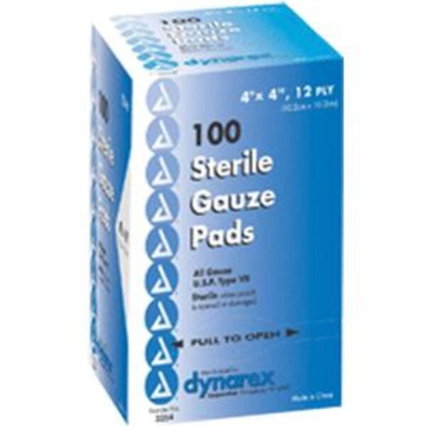 Gauze Pads Sponge Sterile 4 Inches X 4 Inches packaged in peel-down pouches for convenient, aseptic handling. Heading Purpose Gauze Pads Manufacturer Dynarex Uses All gauze U.S.P. type VII. Sterile unless pouch is opened or damaged. 4 inches by 4 inches, 12 ply.