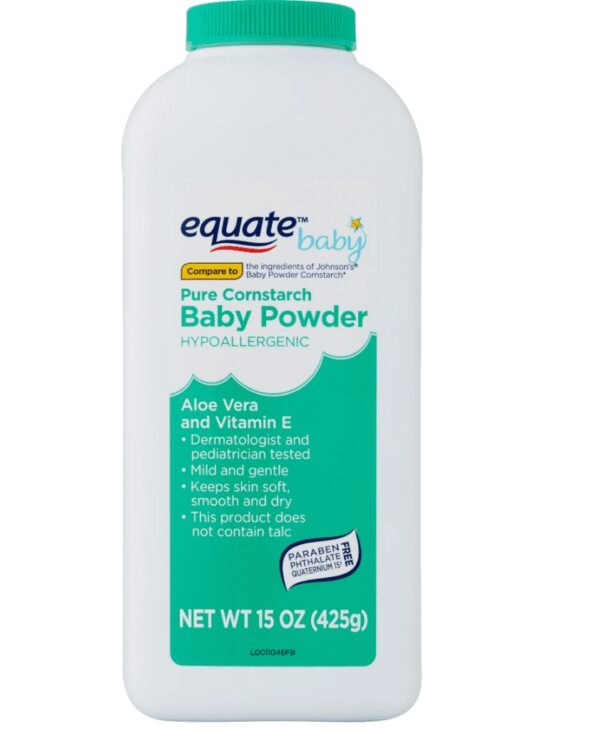 - Equate Baby Pure Cornstarch Baby Powder with Aloe Vera and Vitamin E, 15 oz
