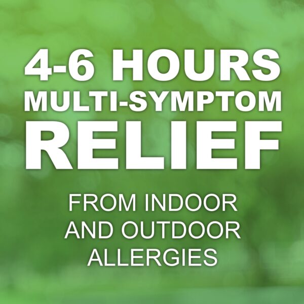 - Multi-Symptom Allergy Relief: This allergy medication provides temporary relief of sneezing, runny nose, itching of the nose or throat and itchy, watery eyes