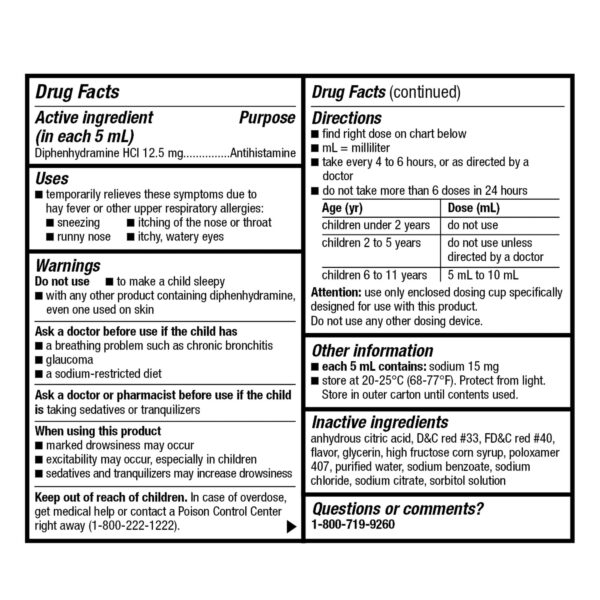 Compare to the active ingredient in Children’s Benadryl Allergy Liquid. Soothe your child’s allergy symptoms with Equate Children’s Allergy Relief. This complete allergy medicine for kids provides 4-6 hours of multi-symptom relief for sneezing, runny nose, itchy throat or nose and itchy, watery eyes. The active ingredient is Diphenhydramine HCl, a powerful antihistamine that relieves symptoms of hay fever or other upper respiratory allergies. Just one dose of this cherry-flavored liquid provides multi-symptom relief from indoor and outdoor allergies. This allergy medication is for children ages 6-11 years. Dosage cup is included. Take every four to six hours, or as directed by a doctor. Gluten and alcohol free.