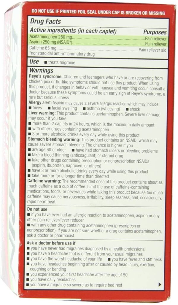 - Each caplet contains 250mg Acetaminophen and 250mg Aspirin (NSAID) for pain relieve and 65mg Therapeutically Active Caffeine as pain relieve aid