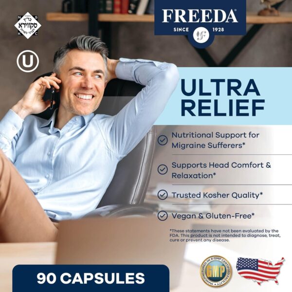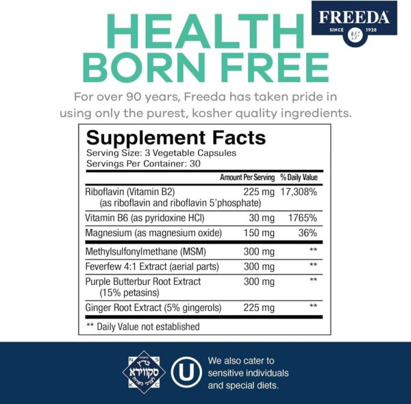 Freeda Ultra Relief Migraine Support Supplement | Vitamin B2, B6, Magnesium, Feverfew, PA-Free Butterbur, and Ginger | Kosher, Vegan, Gluten Free | 90 Capsules