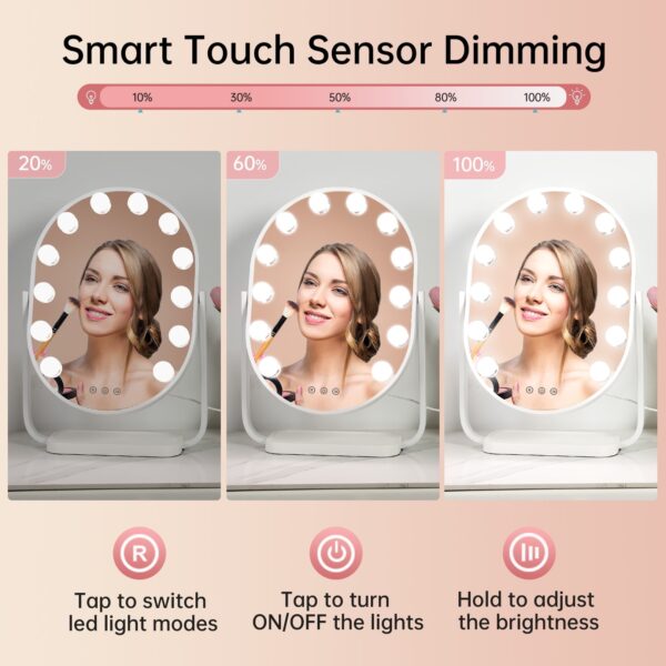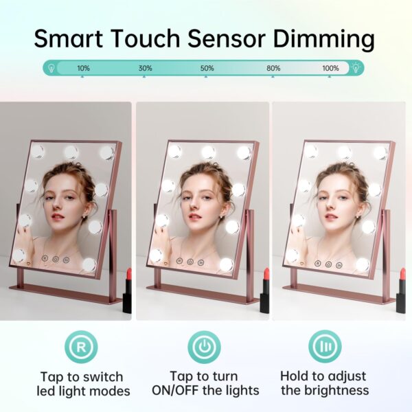- Easily control the mirror’s 12 high-quality LED bulbs with the smart touch sensor switch, allowing you to turn the lights on/off and adjust the brightness to your desired level. The mirror also features a memory function, so the brightness will return to your previous setting even after being turned off and back on.