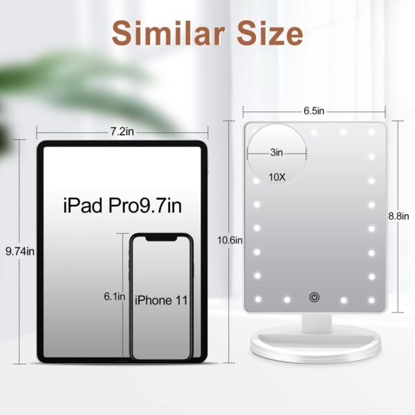 - The lighted mirror features a 1X normal mirror for an overall view of your face, as well as a detachable 10X magnification round mirror that helps you see every detail clearly and apply delicate makeup such as mascara, eyeliner, eyebrow, and lipstick.