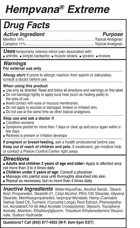Unlike most leading pain brands that only use 4% menthol, Hempvana Extreme 50+ delivers an incredible 16% menthol—four times the strength—plus 11% camphor, both FDA-listed active ingredients proven to fight pain fast. These powerful medicines work together to target pain at its source, providing quick, long-lasting relief when you need it most.