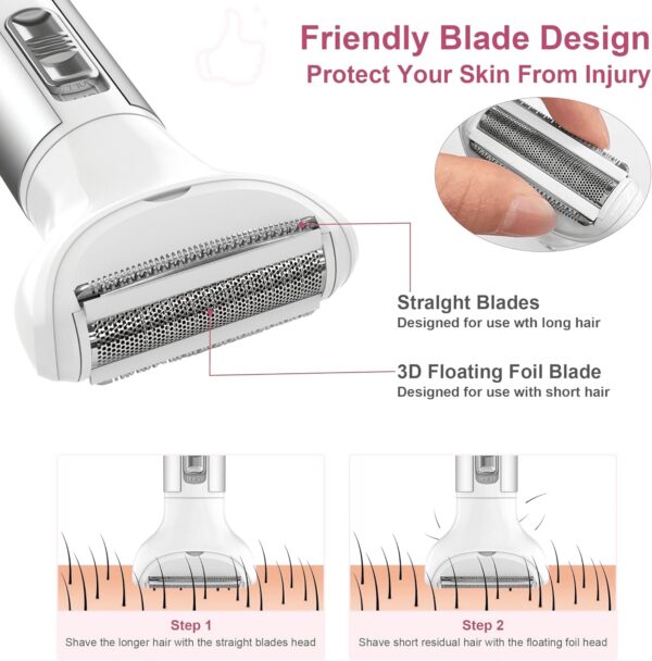 - 【Safe and Effective】The electric shaver has 4 replaceable heads. 1 three-in-one large area shaver, 1 nose hair trimmer, eyebrow shaver and face shave, This razor can help you customize the shaving effect for your face, arms, legs, armpits, nostrils and bikini area in a few minutes, without leaving any residue.