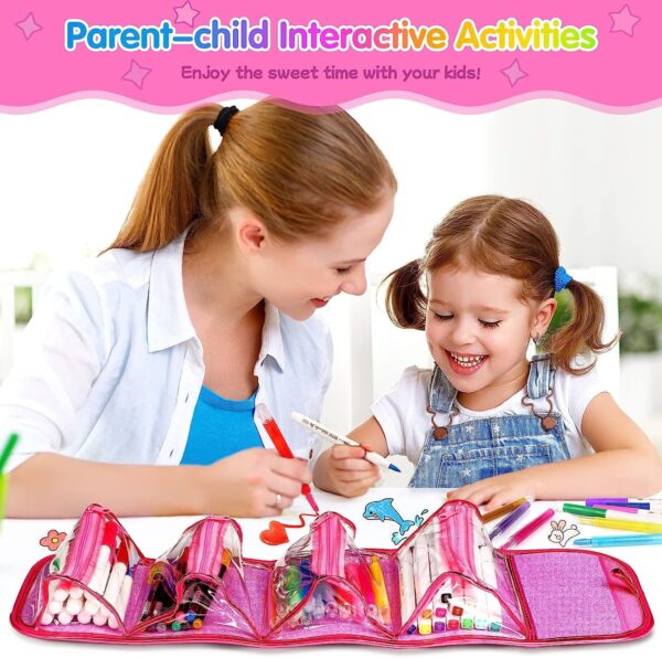 Included with scented glitter pens*9, twist-able crayons*12, dual brush markers*12, washable markers*12, and 20 random frozen stickers to make the drawing more creative. Four zippered compartments make it easy for your kids to keep everything organized.