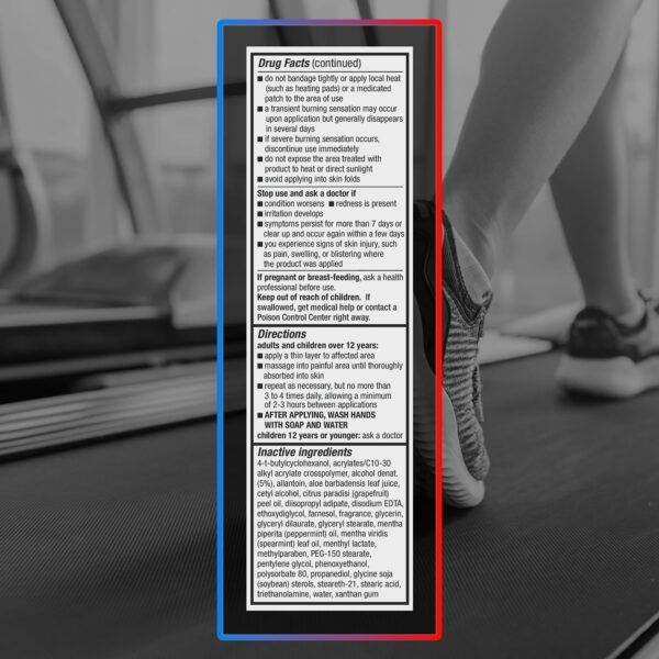 2 Max strength pain relievers – Advanced relief for tough pain. Active Ingredients: Menthol (10%), Methyl Salicylate (30%) Inactive Ingredients: Carbomer, Cetyl Esters, Emulsifying Wax, Oleth 3 Phosphate, Stearic Acid, Triethanolamine, Water