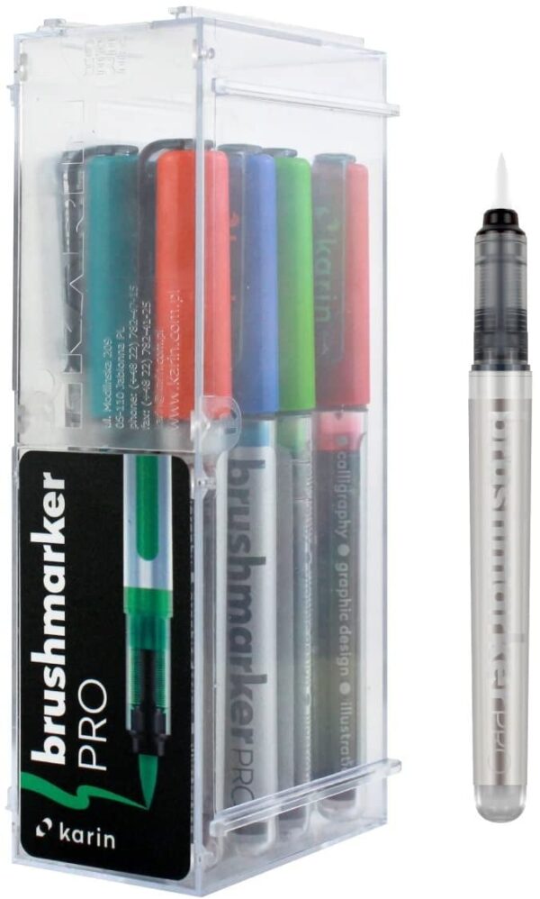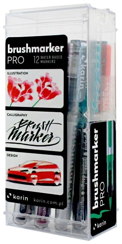 KARIN Brush marker PRO Basic Colors Set of 11 +1 Blender: Brush markers PRO contain 2.4 ml of paint “ink”. Manufactured using “liquid ink” technology these Brush Markers maintain their intensity of color until the very last drop! This superior technology allows you to control the amount of “paint” used making then twice as efficient as traditional filter markers. In addition, they are equipped with a Japanese super durable and flexible nylon tip. They contain non-toxic paints with an intense dye based color.