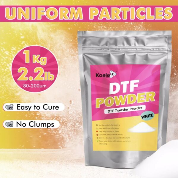 - 4. Superior DTF Powder: The 2.2 lb Koala DTF Powder offers excellent adhesion and durability for your transfers. This white DTF transfer powder is specially formulated for DTF sublimation transfer, providing long-lasting and vibrant results.
