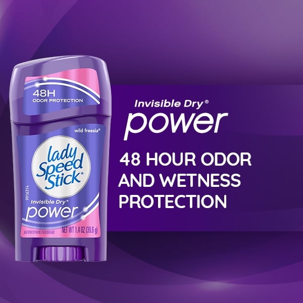 Feel fresh, confident and unstoppable with Lady Speed Stick Invisible Dry Antiperspirant Deodorant stick. This Lady Speed Stick antiperspirant for women provides 48-hour odor and wetness protection for maximum confidence. Lady Speed Stick Invisible Dry Power Antiperspirant Deodorant is a solid stick that reduces underarm perspiration. With the fresh scent of Wild Freesia, this deodorant for women will help you smell great and feel confident all day.