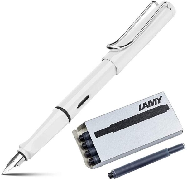 - 1 x Lamy Safari white color fountain pen (includes 1 Blue ink cartridge)