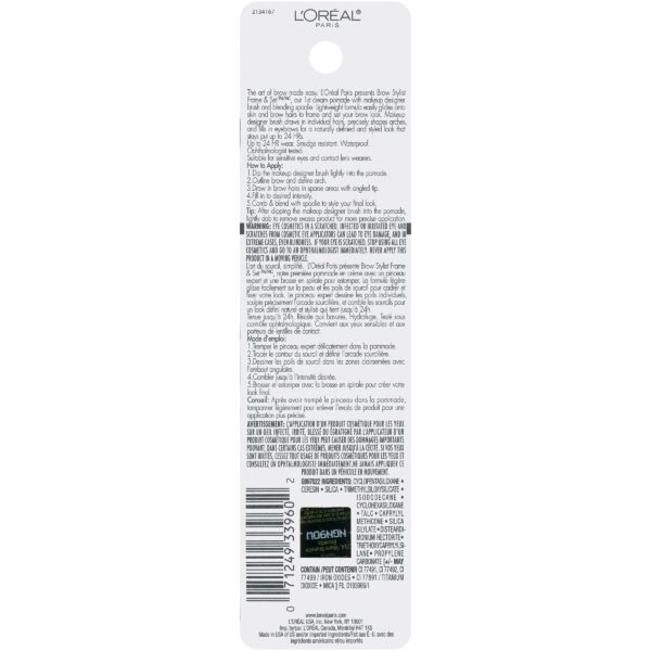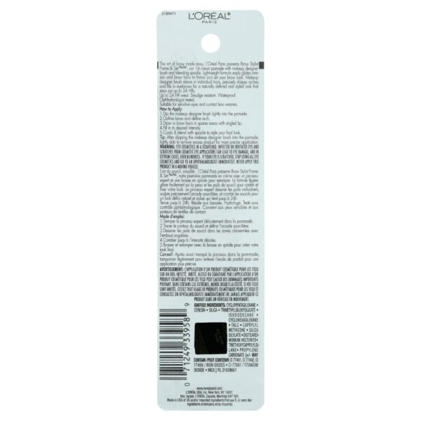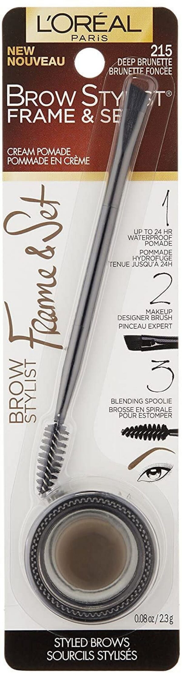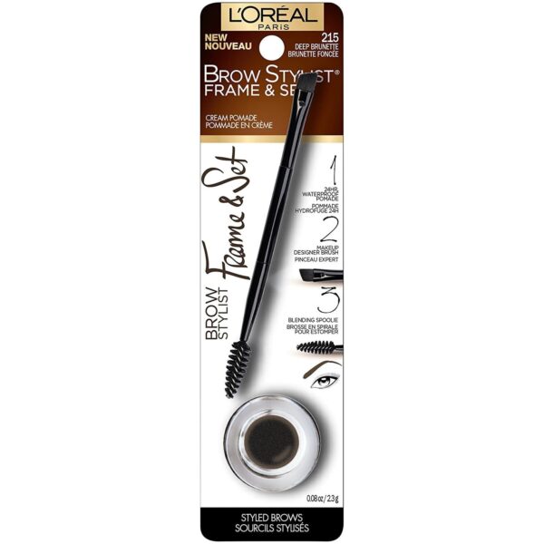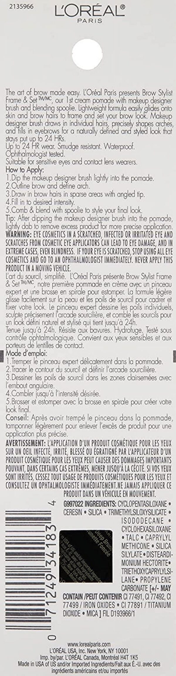L’Oreal Paris Brow Stylist Frame and Set, Light Brunette, LOreal Paris presents Brow Stylist Frame Set, our 1st brow pomade with makeup designer brush and blending spoolie. The lightweight formula easily glides onto skin and brow hairs to frame and set your brow makeup look. Makeup designer brush draws in individual hairs, precisely shapes arches and fills in eyebrows for a naturally defined and styled brow makeup look that stays put up to 24 hours. Tip: After dipping the makeup designer brush into the brow pomade, lightly dab to remove the excess product for more precise application.