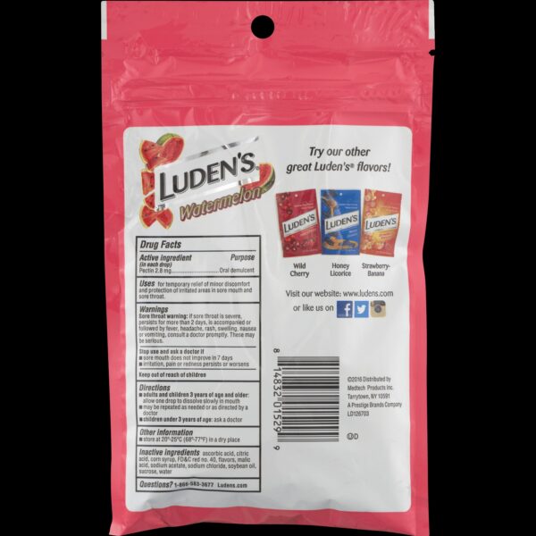 Luden’s® Throat Drops Watermelon. Contains pectin lozenge, a oral demulcent. Soothes your throat, tastes great! For temporary relief of minor discomfort and protection of irritated areas in sore mouth and sore throat.