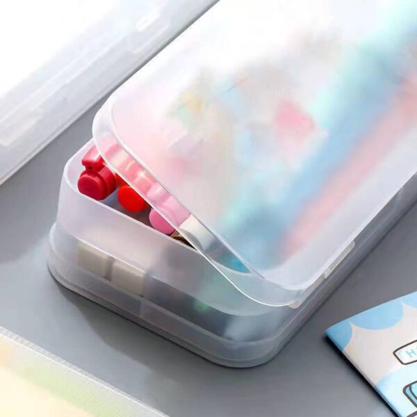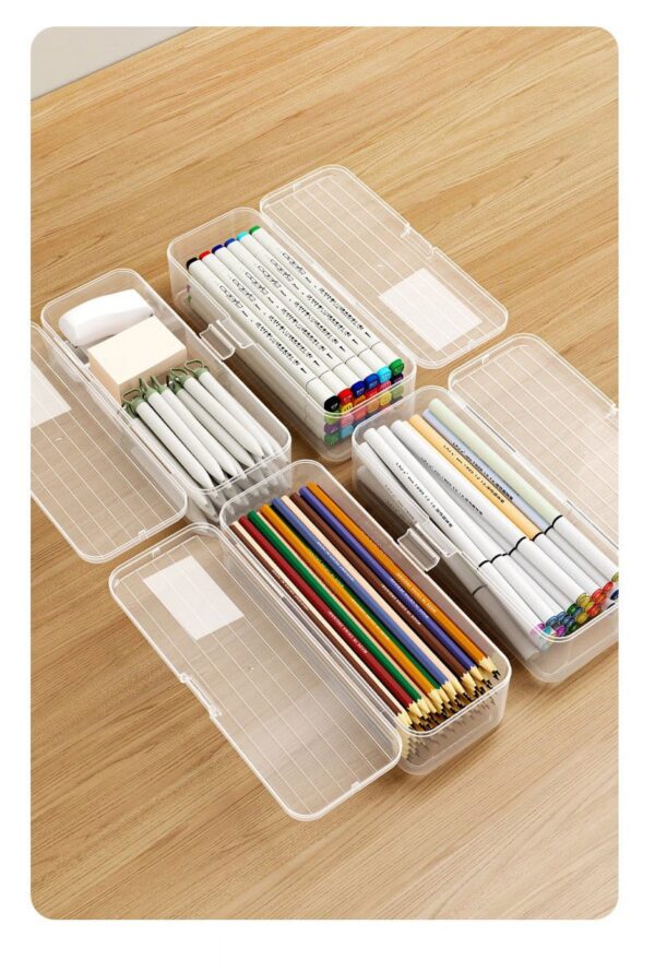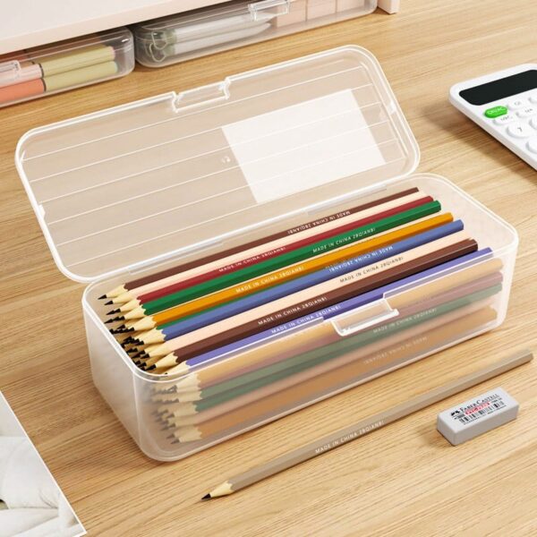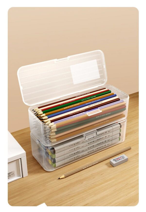 Extra Large Capacity Plastic Pencil Box Stackable Translucent Clear Pencil Box Office Supplies Storage Organizer Box For Gel Pens Erasers Tape Pens Pencils Mark<br />Features:<br />Stackable & Compact Design- The stackable and compact design saves space and keeps desks and organized, also fits neatly in backpacks and drawers.<br />Snap-tight Lid & Handles Keep Contents Secure- Multipurpose plastic pencil box, keep all your pencils in and pencil box Locking handles to keep contents secure.<br />Durable & Transparent: Made of durable plastic, and see-thru box is great for school supplies, translucent design offers visibility of the contents.<br />Widely Use: This pencil box is perfect to be used for school, office or at home for storing coloring pencils, markers other art supplies and more. The stackable pencil box offers a great way to organize writing utensils in your classroom or work area.<br /> Product includes: 1x transparent stationery storage box Product Description:<br />Product includes: 1x transparent stationery storage box<br />