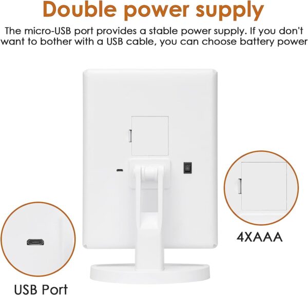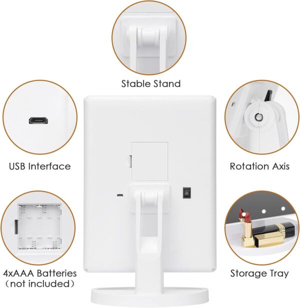 - Dual power supply; makeup mirror with lights, USB and battery dual-use; USB cable included, Batteries not included