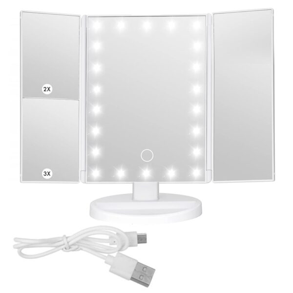 The color of the lighted makeup mirror is white, one of the most popular colors of the female. The tri-fold lighted makeup mirror, featuring one of the brightest lighted mirrors with 22 LED bulbs. The makeup mirror can be rotatable that can be held at the angle you needed.