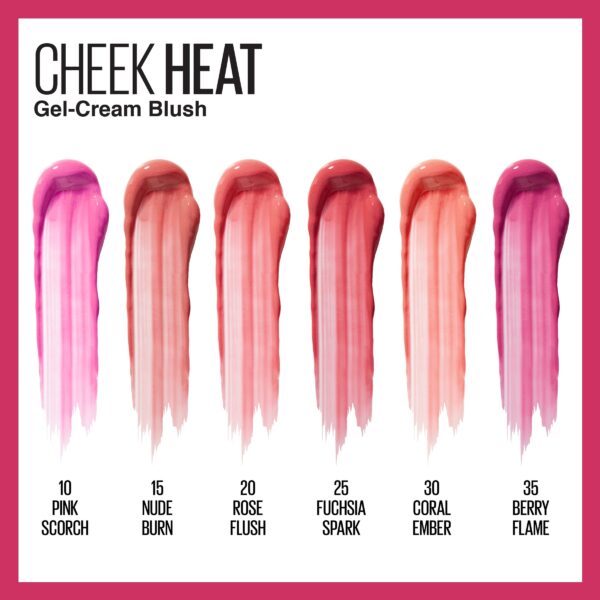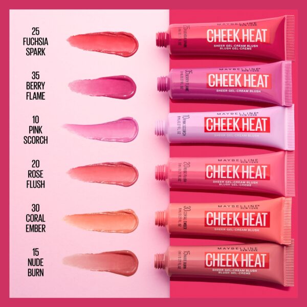 Warm up your cheeks with our new Cheek Heat Gel-Cream Blush! Create a sheer flush of color instantly with this oil-free, water-based formula that glides onto the skin leaving behind a soft natural-looking dewy finish. It’s infused with soft colorful pigments for a buildable blush that you can tone up or down for a natural flushed effect. Simply layer it for the blush look you love. Available in six new blush shades and tubes: available in Nude Burn, Pink Scorch, Rose Flush, Coral Ember, Fuchsia Spark and Berry Flame. A little goes a long way. For a more pigmented, flushed look, add more product as desired.