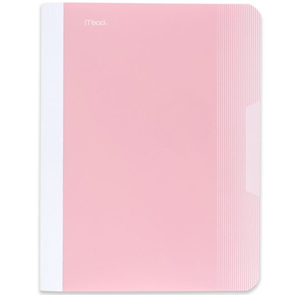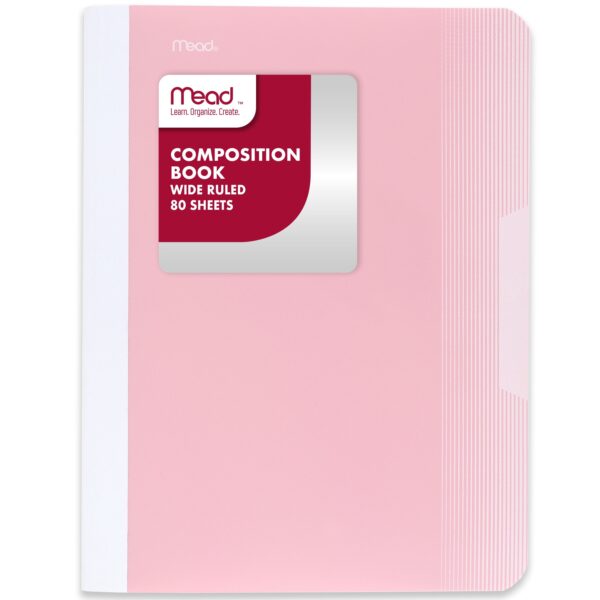 This Mead composition book has 80 double-sided, wide ruled sheets paper, which gives you plenty of writing space. The wide ruled sheets are securely sewn in, and the one-piece plastic cover helps protect your notes. The smooth wireless sewn binding won’t snag on your clothing or backpack. Available in Pastel Pink.