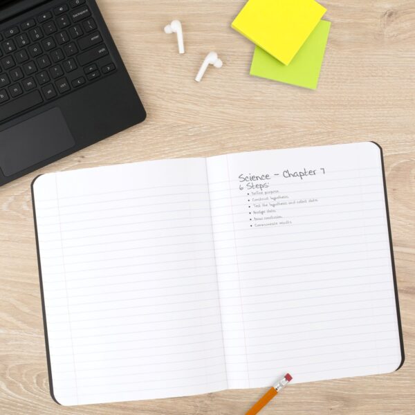 - Ruled sheets are securely sewn in. The one-piece plastic cover helps protect notes all year long. Cover lies flat when open for easy notetaking.