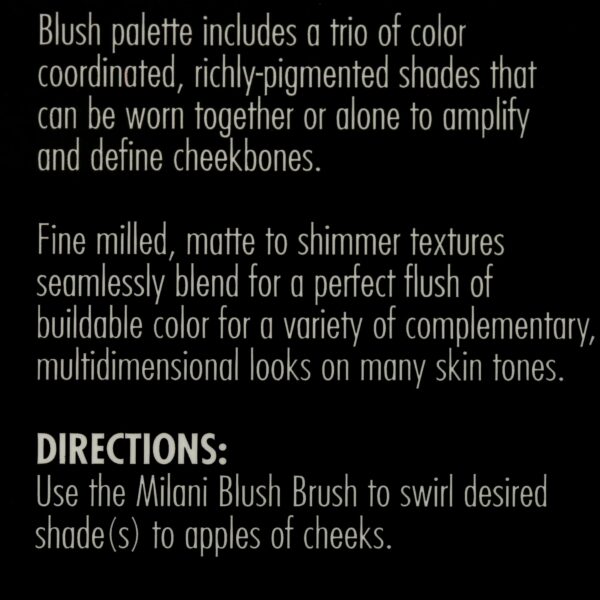 - TIPS & TRICKS: Use the Milani Blush Brush to swirl the desired shade(s) starting at the apple of your cheek and gently swiping up and away. The buildable formula enables you to create a natural or more rosy look.
