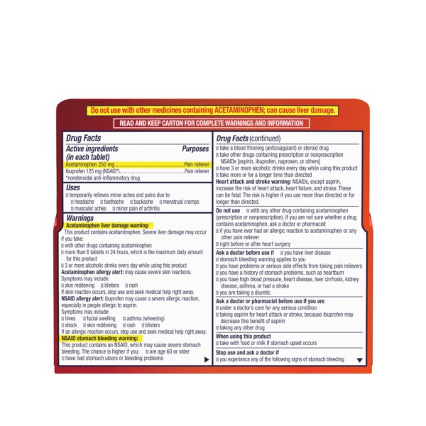 - 250 mg acetaminophen plus 125 mg ibuprofen (nonsteroidal anti-inflammatory drug) in each tablet