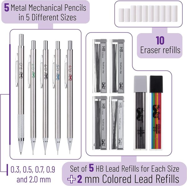 Mr. Pen Mechanical Pencil Set with Erasers Refills, 0.3mm, 0.5mm, 0.7mm, 0.9mm and 2mm, 5 Count